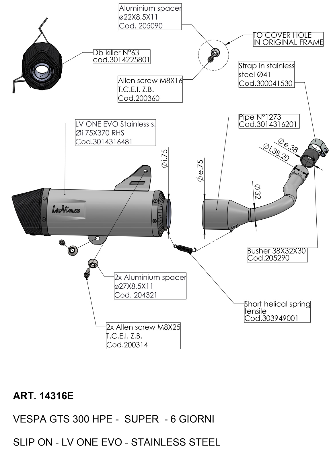 14316E - Exhaust Muffler LeoVince LV ONE EVO SS VESPA GTS 300 (19-20)