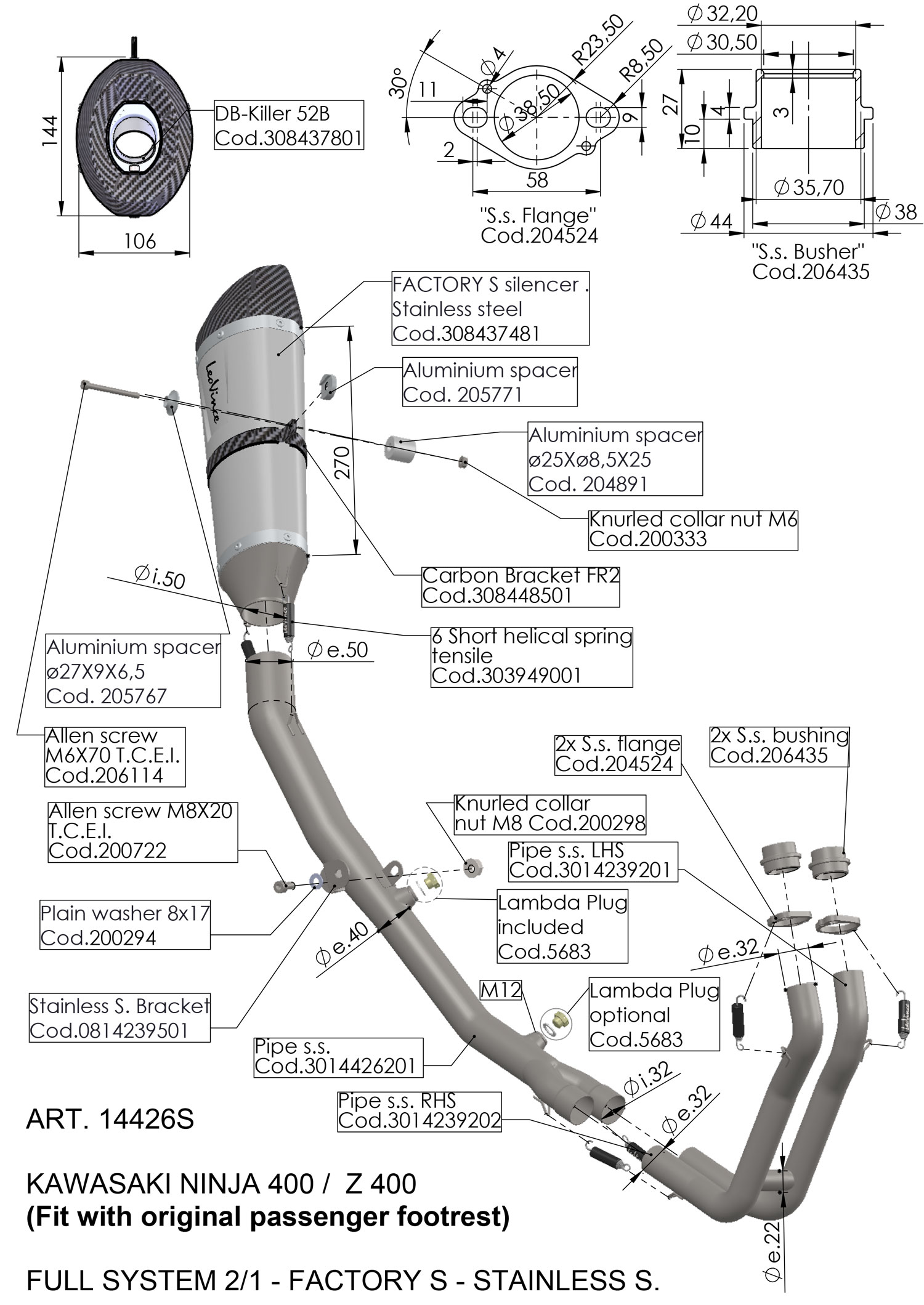 14426S - Exhaust LeoVince FACTORY S Stainless steel KAWASAKI NINJA 400 (18-21)
