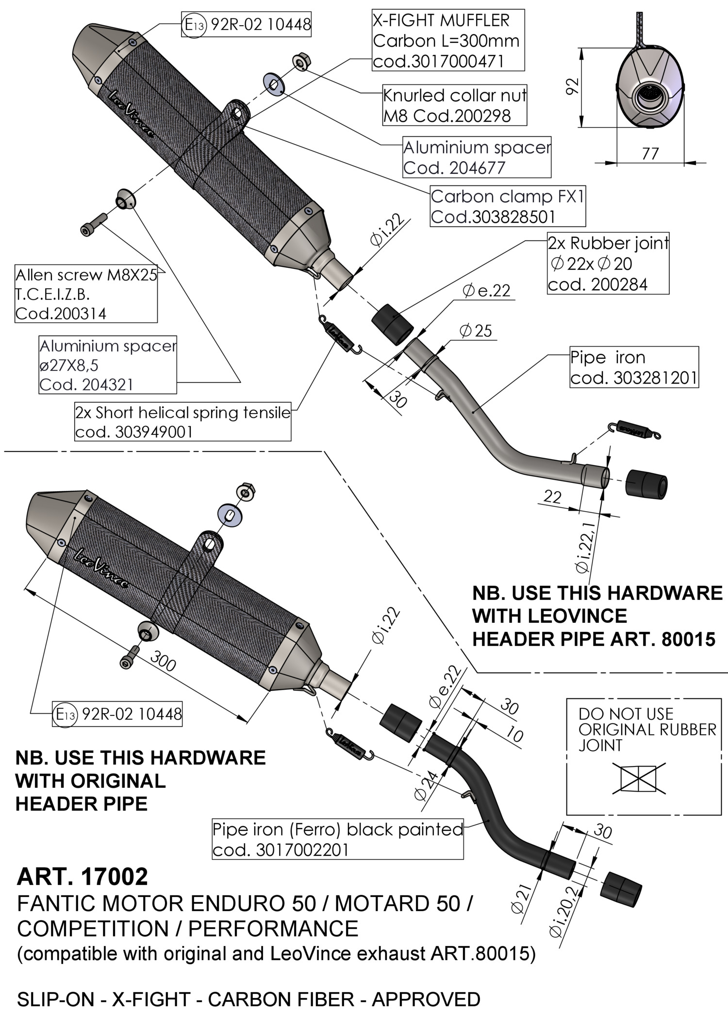 The aggressive and innovative style has always characterized LeoVince X-FIGHT, the exhaust conceived for 2 stroke 50cc engines destined for both off-road and road motorcycles. From today the line is enriched with the X-FIGHT CARBON version, the evolution of this great classic. The body in "full carbon", formed by two layers of pre-preg carbon fiber, is synonymous with lightness and gives to the exhaust a darker and more aggressive look. The bracket is also made in "full carbon" for maximum lightness and best performance. The exhaust also features a sticker with the LeoVince logo, to emphasize the all-Italian design.