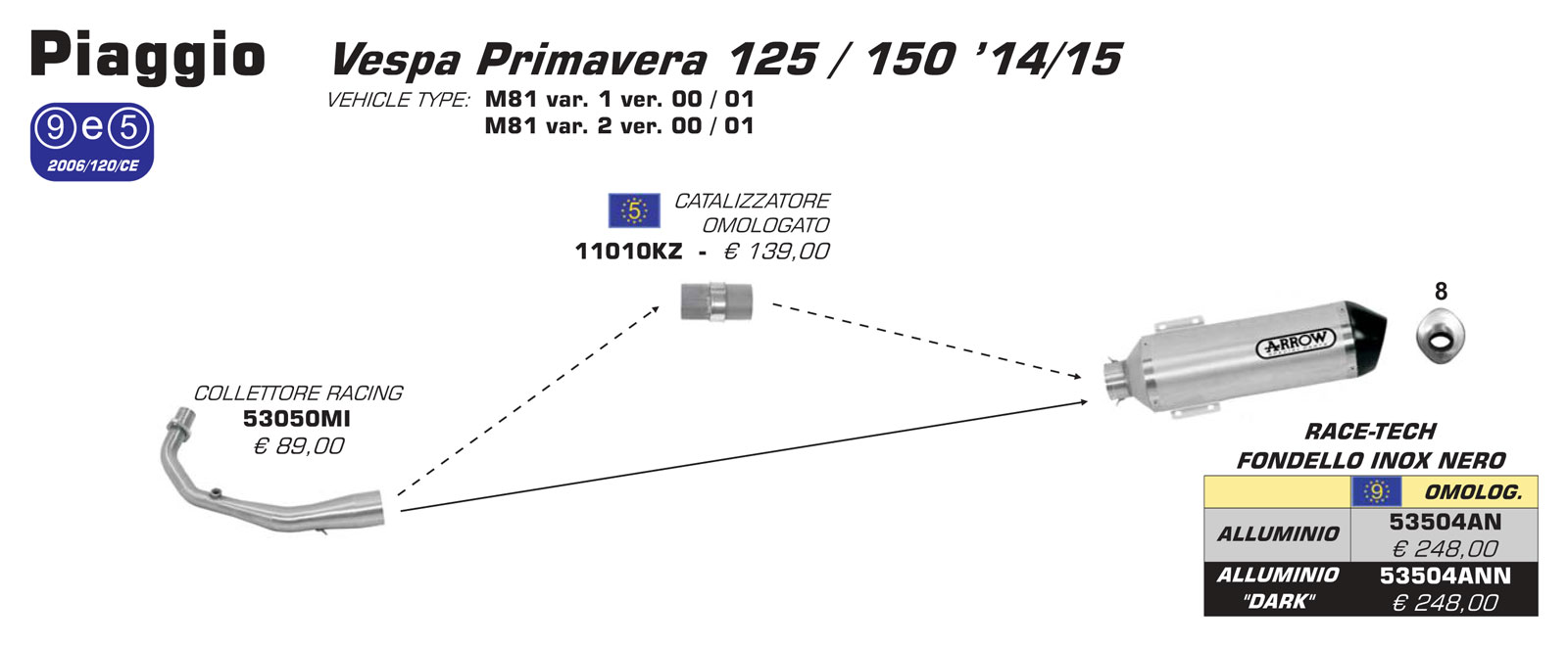 Exhaust Muffler Arrow Race-Tech Aluminum Dark Stainless Steel Cap Dark Approved Vespa Primavera 125 '14