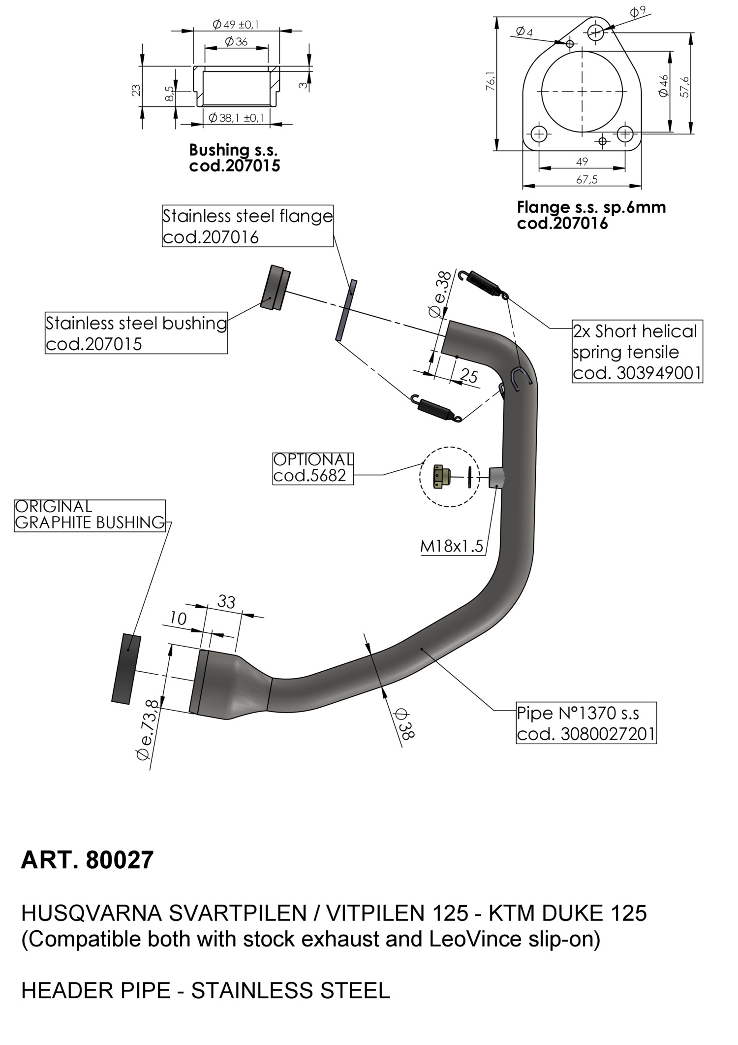 80027 - Exhaust manifold LeoVince Racing HUSQVARNA SVARTPILEN 125 (21-23)