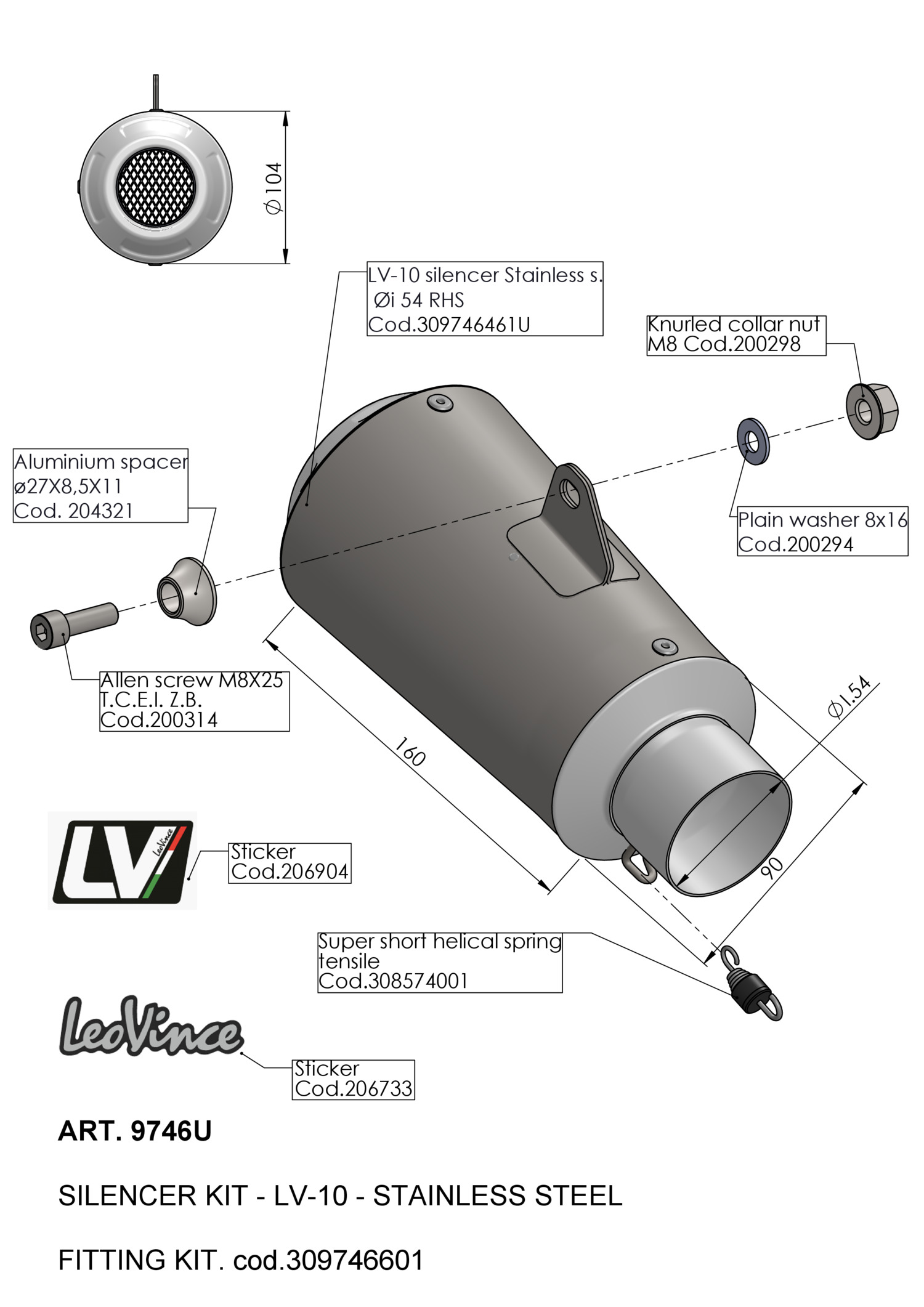 9746U - Exhaust muffler LeoVince LV-10 Stainless steel Ø 54