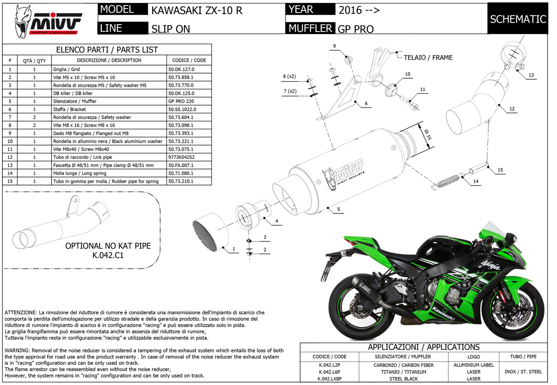 GP PRO, manufactured by semi-handmade TIG welding, shows a compact and essential design and an aggressive sound. Inspired by the world of competition, the exhaust pipe is equipped with a removable protective grille that hides the dB-killer. This muffler sports the characteristic Mivv logo created by laser technology.