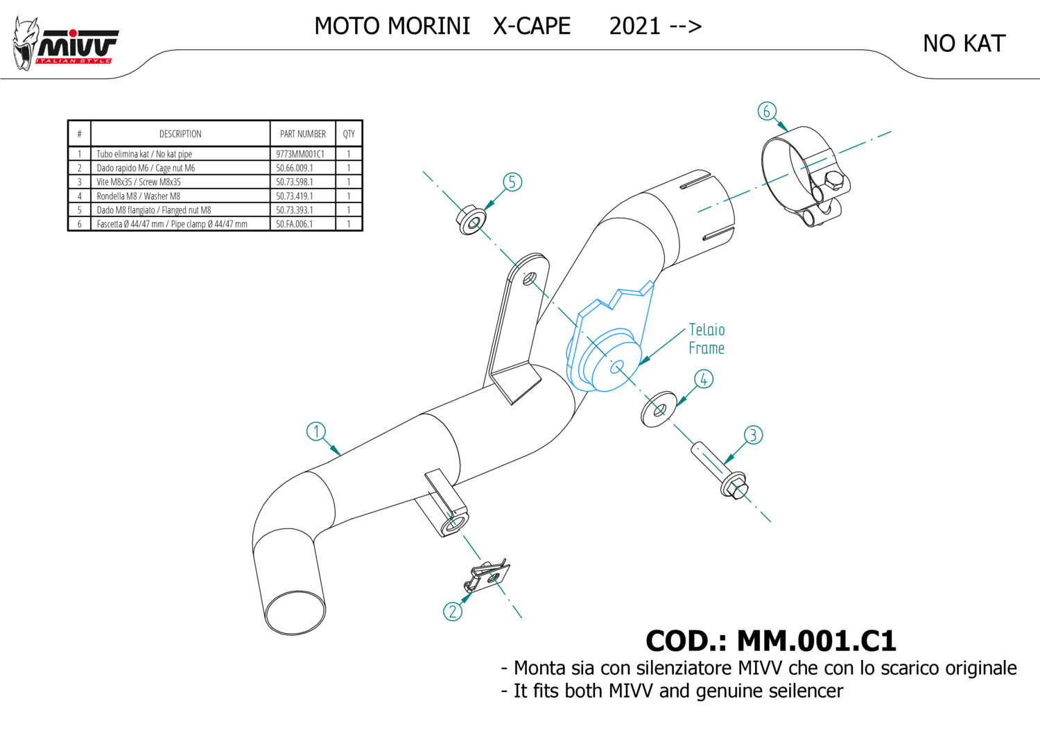 NOTICE: De-cat pipe (compatible with both MIVV and original silencers).