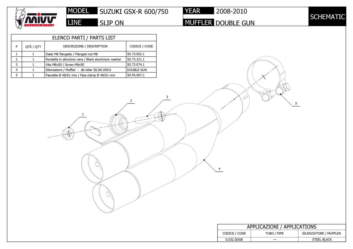 S.032.SDGB - Exhaust muffler Mivv DOUBLE GUN Black SS SUZUKI GSX-R 600 (08-10)