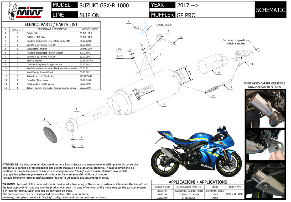 GP PRO, manufactured by semi-handmade TIG welding, shows a compact and essential design and an aggressive sound. Inspired by the world of competition, the exhaust pipe is equipped with a removable protective grille that hides the dB-killer. This muffler sports the characteristic Mivv logo created by laser technology.