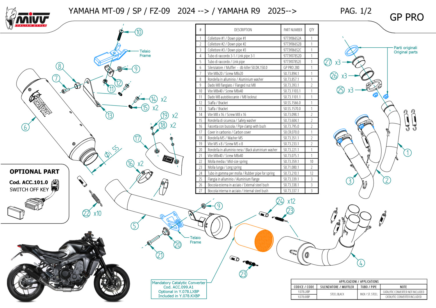 NOTICE: CARBON HEAT-SHIELD INCLUDED. TYPE APPROVED ONLY WHEN ACC.099.A1 CATALYST IS INSTALLED. Installing this exhaust system without the catalytic converter and the switch-off key may cause the engine warning light to come on. Removable catalyst ACC.099.A1 available as an optional part.