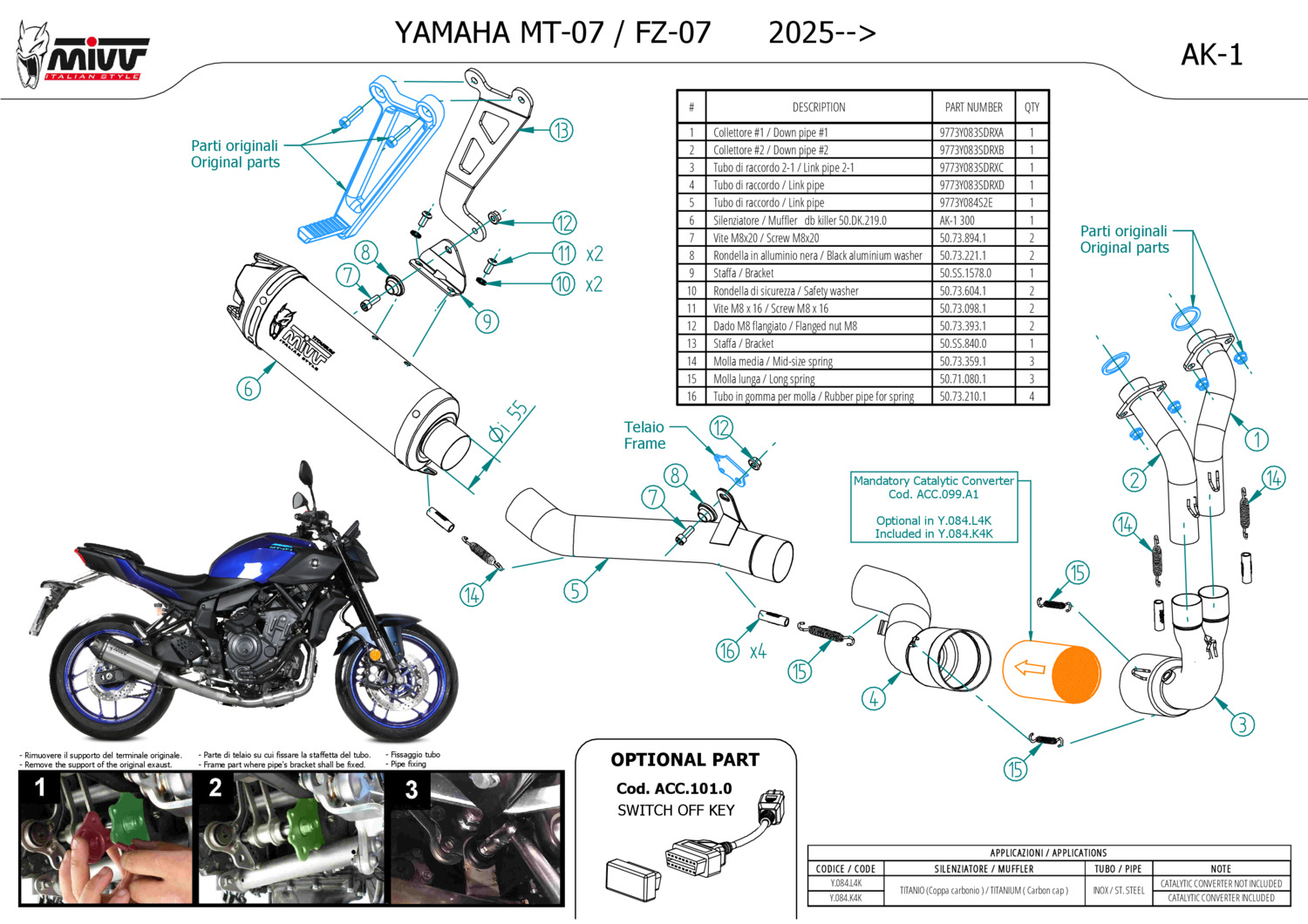 NOTICE: Catalytic converter ACC.099.A1 included. E5+ approved (Reg.EC-EU 134/2014). After installing this exhaust system, the engine warning light (MIL) may come on. If this happens, the optional installation of the Switch-Off Key could solve the issue. For more information, see the “Optional Parts” section