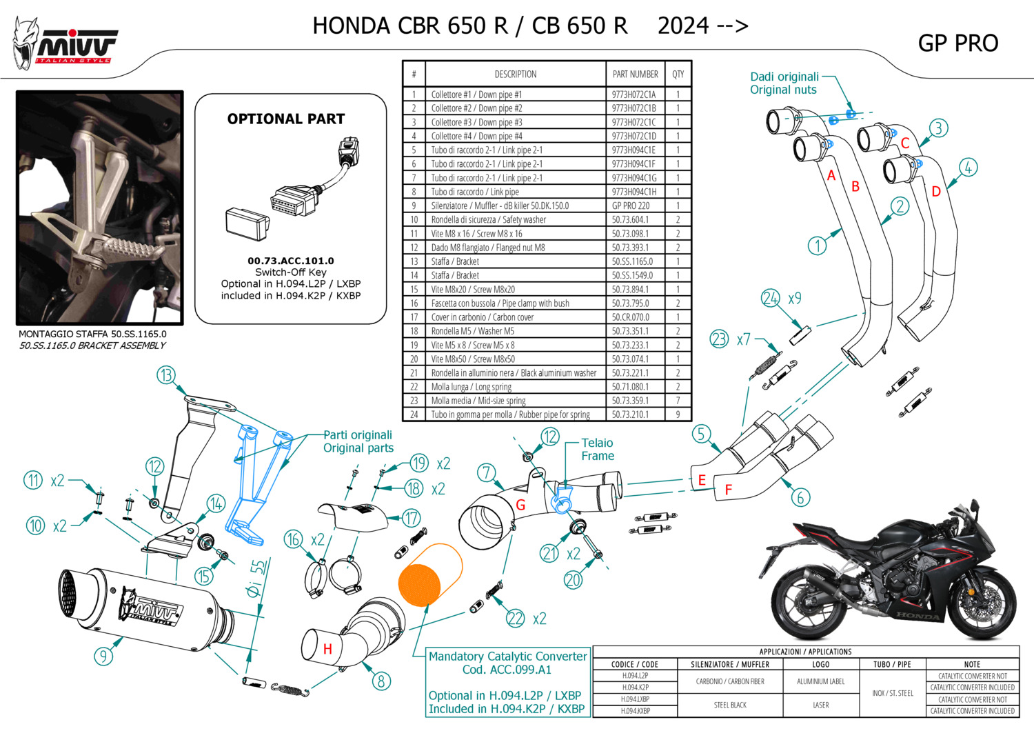 NOTICE: PARE-CHALEUR CARBONE INCLUS. Catalyseur ACC.099.A1 inclus. Homologué E5+ (Reg.EC-UE 134/2014). Suite à l'installation de ce système d'échappement, le voyant moteur (MIL) pourrait s'allumer. Si cela se produit, l'installation optionnelle de la Switch-Off Key permettrait de résoudre le problème. Pour plus d'informations, consultez la section “Pièces En Option”.