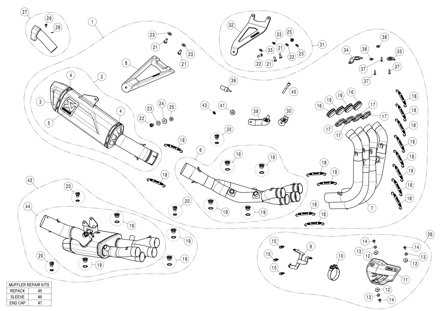 Nell'immagine del prodotto, il sistema è mostrato insieme allo scudo termico in carbonio opzionale P-HSB10E3. La staffa del silenziatore in fibra di carbonio (necessaria per il montaggio in caso di rimozione dei poggiapiedi passeggero) è già inclusa nel sistema.
